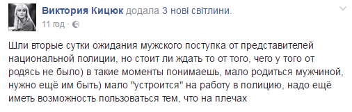 "Шли вторые сутки ожидания мужского поступка от представителей национальной полиции (но стоит ли ждать то от того, чего у того отродясь не было) в такие моменты понимаешь, мало родиться мужчиной, нужно ещё им быть, мало "устроится" на работу в полицию, надо ещё иметь возможность пользоваться тем, что на плечах", - написала судья.