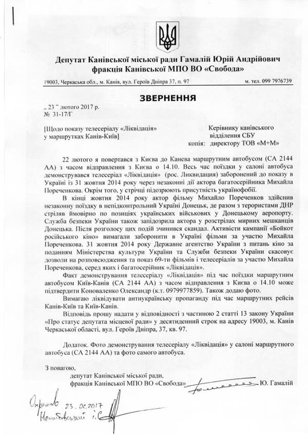 Як зазначається у тексті документу, який за підписом депутата адресований керівнику канівського відділення СБУ та директору підприємства-перевізника, 22 лютого, повертаючись із Києва до Канева, він запримітив, що під час поїздки у салоні автобуса демонструвався телесеріал «Ліквідація», заборонений до показу в Україні з 31 жовтня 2014-го року через незаконні дії одного з акторів відповідної кінокартини - Михайла Поречинкова.