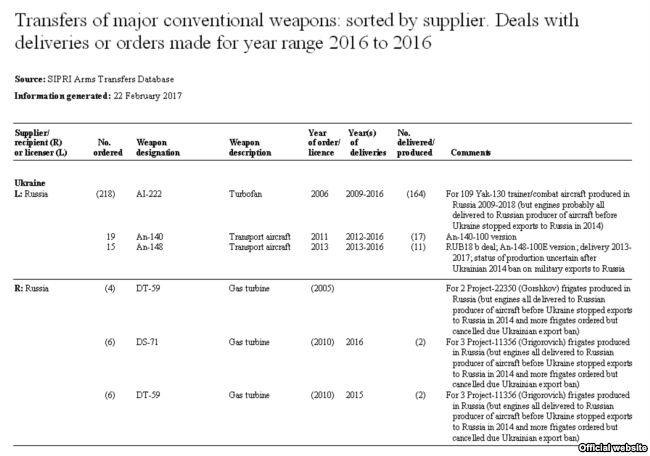 Так, во-первых, есть вопрос относительно временных отрезков украинско-российского военно-технического сотрудничества (ВТС), на основе которых сотрудники SIPRI делают свои «сенсационные» выводы. Ведь в вышеупомянутой таблице, которая, скорее всего, и стала основанием для выводов в отношении суммы украинского экспорта ВВТ в Россию в 2016 году, должны были содержаться данные относительно вооружения, которое было экспортировано собственно в 2016 году. Однако в таблице почему-то также приведены данные по передачи ВВТ и за довоенный период, то есть до 2014 года. При этом есть данные, что некоторая продукция в 2016 году вообще не поставлялась (что на самом деле близко к истине).