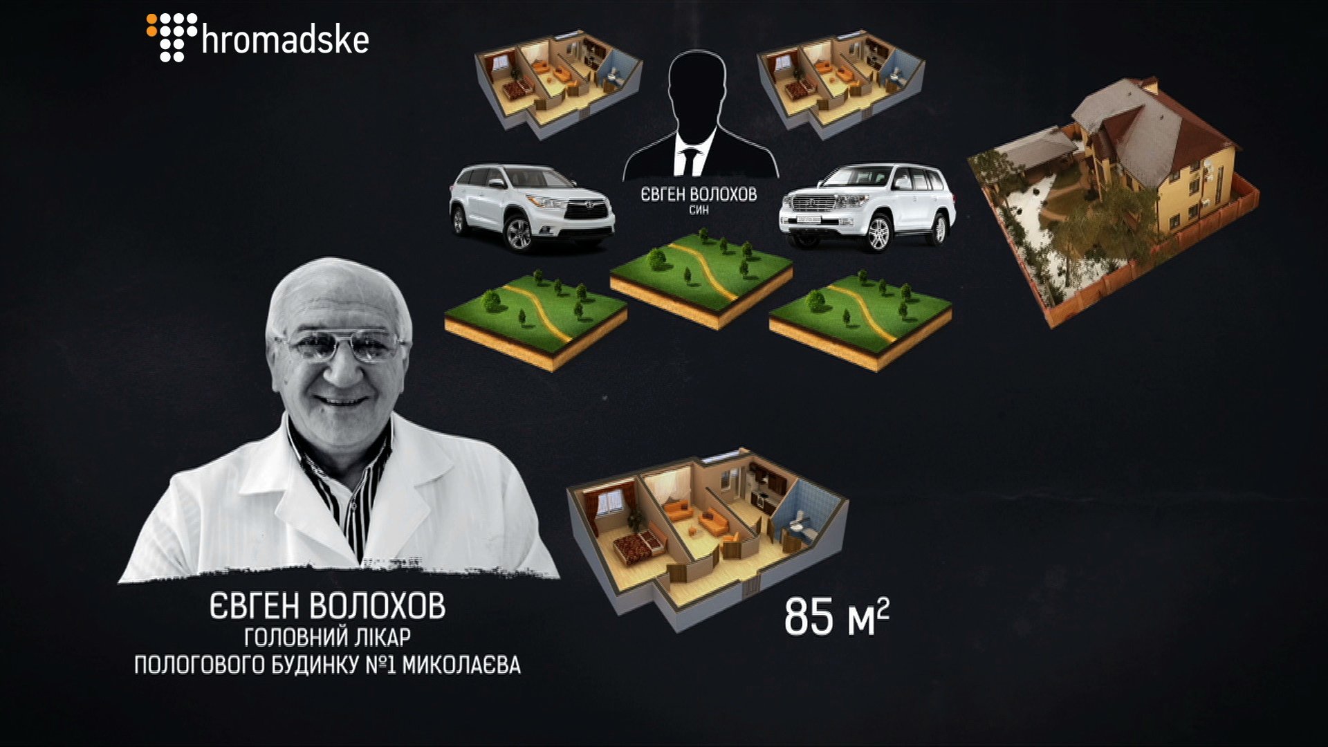 Головний лікар Євген Волохов керує першим пологовим будинком майже 30 років. За цей час він встиг стати заслуженим лікарем України, депутатом міської ради та почесним громадянином Миколаєва. Та крім цього, його родина встигла непогано підвищити свої статки. Більша частина сімейного майна записана на сина. А це дві квартири, два позашляховика, три земельні ділянки та шикарний будинок біля моря. Сам головний лікар володіє квартирою на 85 квадратних метрів у Миколаєві.