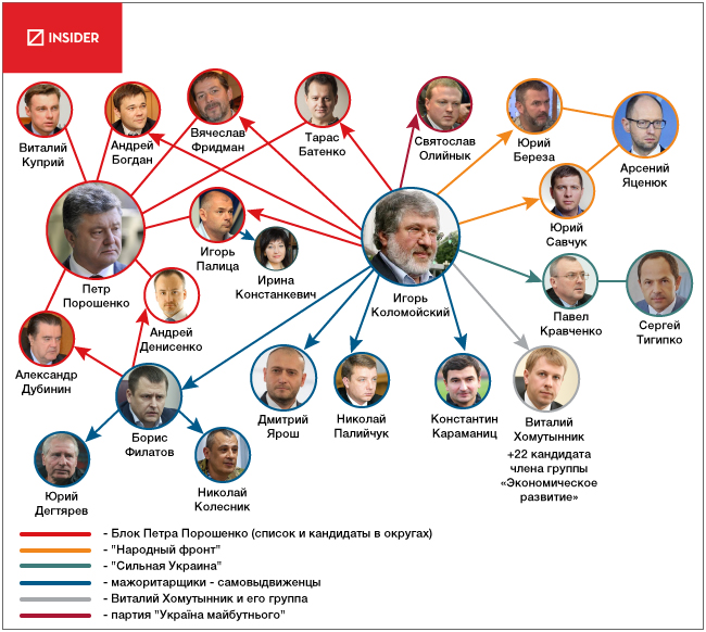В то же время один из членов центрального штаба БПП в неофициальной беседе с INSIDER сообщил, что, по предварительной договоренности Порошенко, Коломойского и Хомутынника, последний в новом составе парламента вместе со своими людьми войдет в состав фракции БПП, где возглавит группу депутатов, в том числе и из протеже Коломойского.