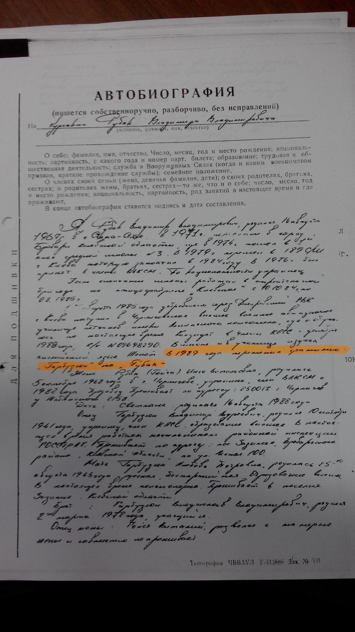 Другая интересная деталь -  в своей автобиографии Рубан указал, что в 1989 году по какой-то причине сменил свою настоящую фамилию Гарбузюк на фамилию Рубан.