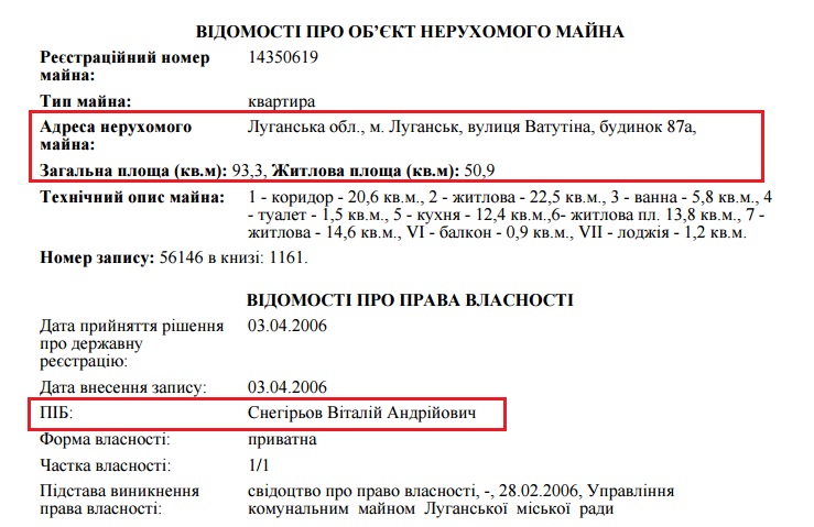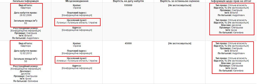 Что касается имущества, то в декларации за 2014 и 2015 годы указанные две квартиры площадью 93 и 50 кв.м. в г. Луганске и квартира площадью 52 кв. м. в городе Алчевск Луганской области.