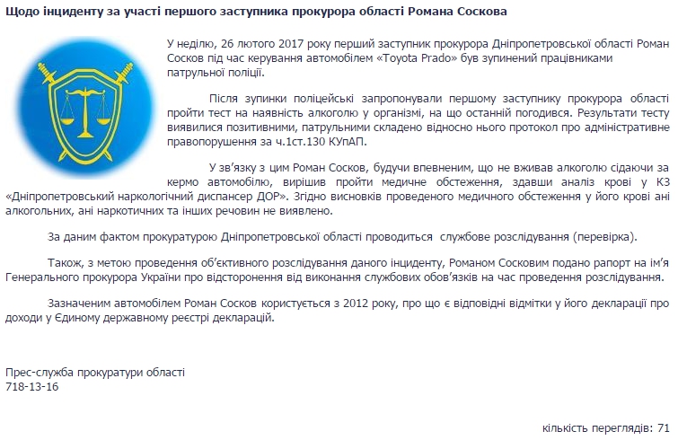 В тот день первого заместитель прокурора Днепропетровской области остановили полицейские и попросили пройти тест на алкоголь. «Результаты теста оказались положительными и патрульными составлен в отношении него протокол об административном правонарушении по ч.1ст.130 КоАП, — говорится в сообщении прокуратуры области. — Роман Сосков, будучи уверенным, что он алкоголь не употреблял, решил пройти медицинское обследование. Он сдал анализ крови в «Днепропетровском наркологическом диспансере». Согласно результатам обследования в его крови ни алкогольных, ни наркотических не обнаружено».