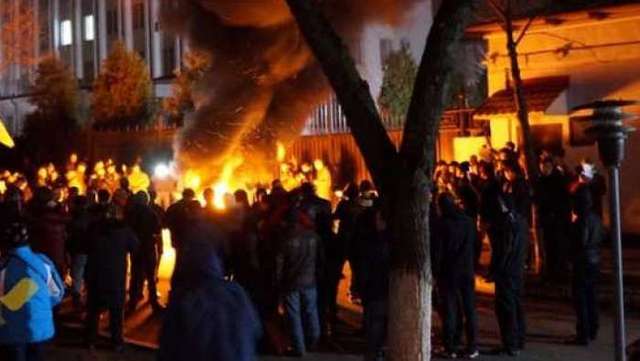 Представители СБУ, которые вышли к активистам, обвинили их в желании попиариться. В ответ протестующие подожгли автомобильные шины.