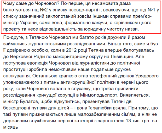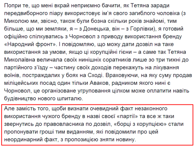 "Что же касается аферистов вроде Арсения Яценюка или Татьяны Чорновол, то они, придумывая партию для непритязательного электората, так спешили зарегистрироваться в ЦИК, что даже не провели проверку названия на патентную чистоту. И когда им, бедным, было этим заниматься, если еще за несколько дней до памятного съезда руководителем партии "Народный фронт" значилась некая Иванченко Оксана Павловна, которая и зарегистрировала эту "партию" в апреле 2014 в Ворошиловском районе г. Донецка", - написал Бойко.