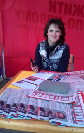 Працівники агітаційних наметів Блоку Петра Порошенка в 96 окрузі Київської області разом зі своїми газетами роздають вкладки та газети депутата-регіонала Ярослава Москаленка.