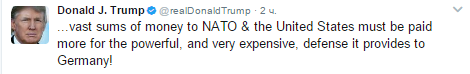 "Германия, однако, должна НАТО значительные суммы и должна платить США больше за мощную и очень дорогую оборону, которой ее обеспечивают", – добавил президент США в следующем своем микроблоге.