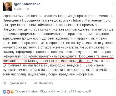 Тогда депутат БПП Кононенко опроверг свою причастность к компании Intraco Management Ltd.