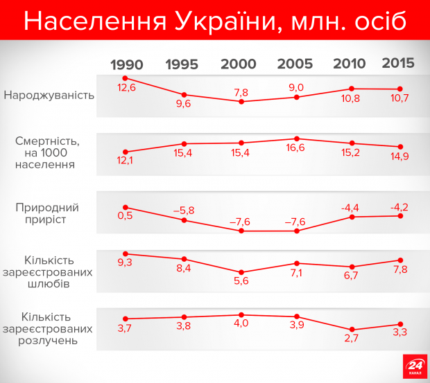 Загалом, якщо аналізувати динаміку, то кожних 5 років, починаючи з 1995 року, населення нашої країни скорочувалось приблизно на 2 мільйони осіб. Щоправда, різниця між 2010 і 2015 роком спричинена не природними факторами, а окупацією частини нашої країни Росією.