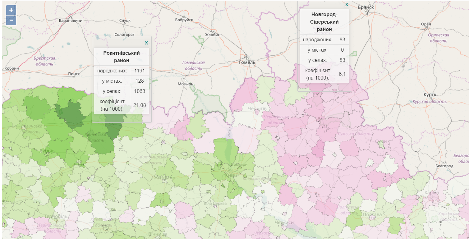 3. Самый высокий коэффициент рождаемости — в Рокитнянском районе, самый низкий — в Новгород-Северском районе. Разница на душу населения — 3.5 раза.