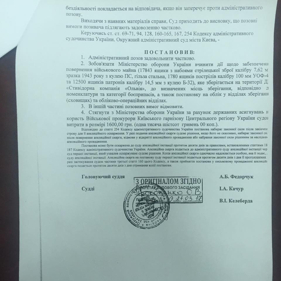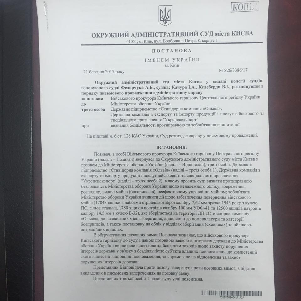 Главный военный прокурор Украины Анатолий Матиос сообщил, что Окружной административный суд Киева обязал Министерство обороны обеспечить возврат боеприпасов на сумму 7,3 млрд гривень из-за невыполнения государственным предприятием (ГП) «Укрспецэкспорт» внешнеэкономического контракта с Эфиопией. Об этом он написал на своей странице в Facebook в четверг, 23 марта.