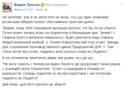 Вадим Трюхан уточнил у своего подписчика, откуда такие мысли и предположения, на что получил ответ: «Не могу скинуть с телефона видео Reuters, где разгружают танки рядом с границей около Мариуполя. Путин сумасшедший и оторван от реальности. Склады подожгли тоже, как подготовка с наступлению», — написал оппозиционер.