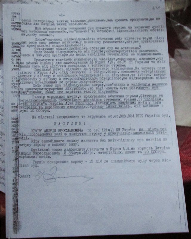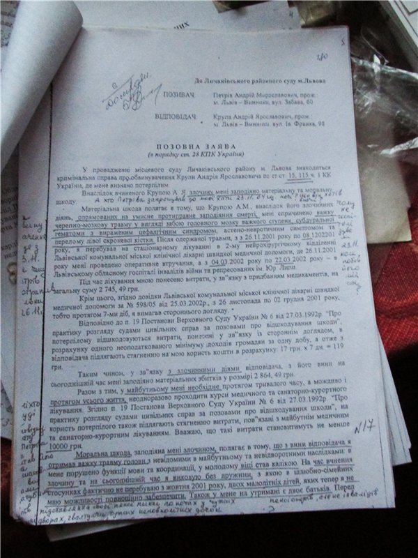 Мирослава Ивановна этой истории не скрывает и охотно демонстрирует все бумаги. Ее сына Андрея Крупу обвинили в том, что он сделала инвалида из насильника сестры – Андрея Петрива. Защищать «пострадавшего» в суде взялся молодой адвокат Олег Махницкий – еще в далеком 2002 году.