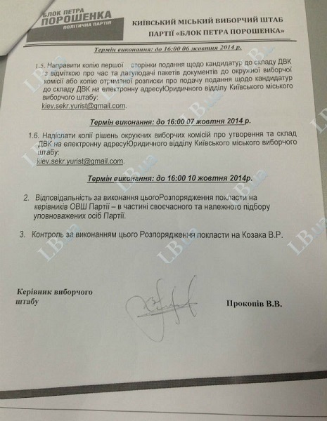 «В распоряжение LB.ua оказалась любопытная бумага. Это – внутренний документ Киевского городского штаба БПП. Озаглавлен – «поручение». Датировка – 2 октября. «Поручение» адресовано нижестоящим штабам.