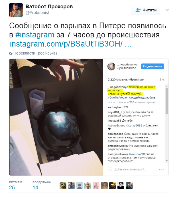 Так, пользователь negodovanya за 7 часов до начала взрывов в метро написал: "Давненько не было терактов...Сегодня будет. Ждите".