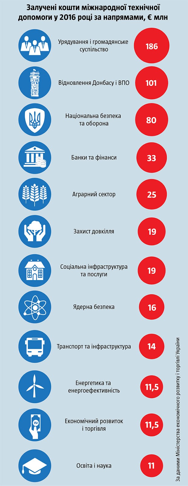 По состоянию на январь 2017 года, по информации МЭРТ, общая сумма действующих проектов международной технической помощи Украине, привлеченной за все время ведения статистики, составляет почти €4,3 млрд. Из них €1,87 млрд — помощь, которую оказывают правительства стран, остальные — проекты международных организаций, таких как ООН, ОБСЕ, ЕБРР или НАТО. Кроме того, есть еще кредитные проекты международных финансовых организаций.