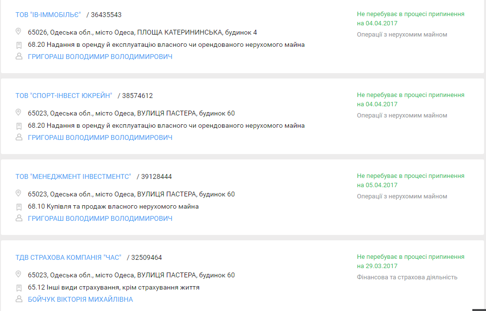 Но вернемся к ООО "Менеджмент инвестментс". Так, руководитель указанной фирмы некий Владимир Григораш значится еще в пяти различных компаниях, зарегистрированных в Одессе и Киеве. Среди них есть ряд фирм, учредителями которых также являются офшорные компании - в частности, ООО "Спорт-инвест юкрейн".