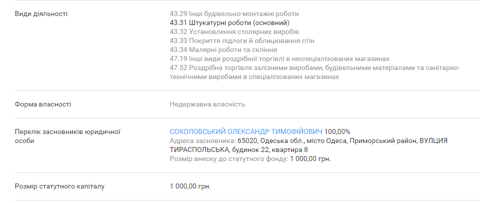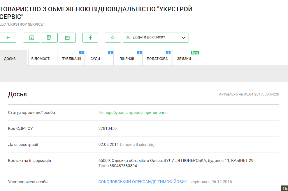 Зарегистрировано ООО, если верить карте, в обычном многоэтажном доме. За основателем компании "Укрстрой сервис" неким Александром Соколовским числится еще несколько разнопрофильных фирм.
