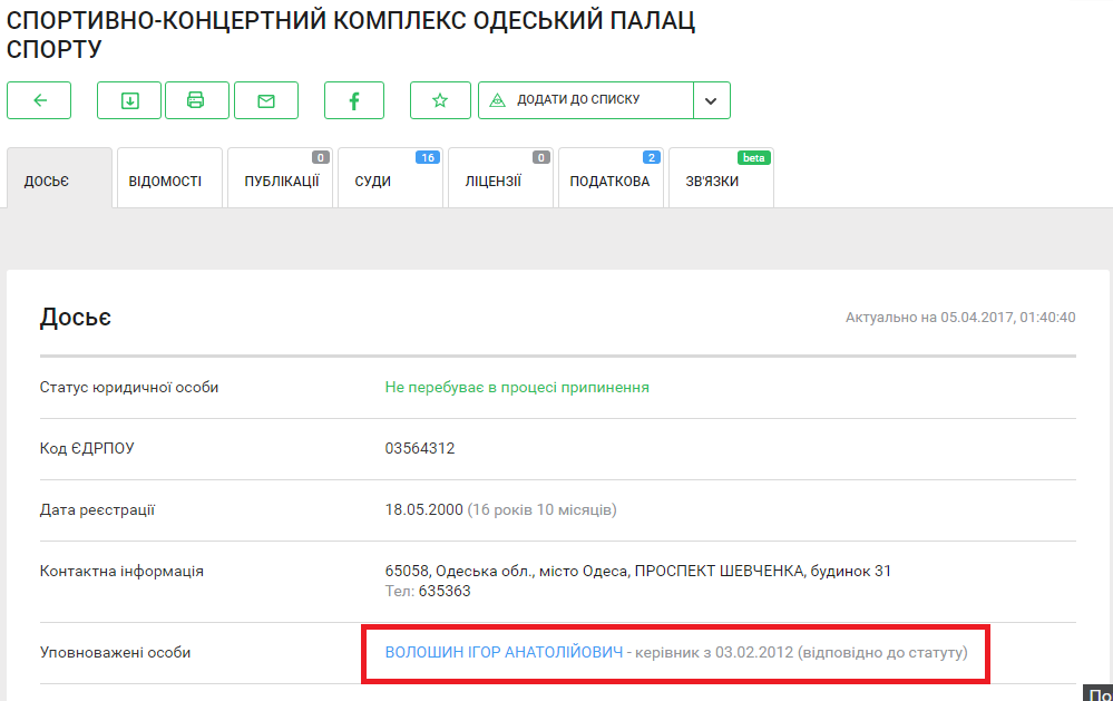 Руководителем Спортивно-концертного комплекса "Одесский дворец спорта" еще с начала 2012 года указан некий Игорь Волошин.