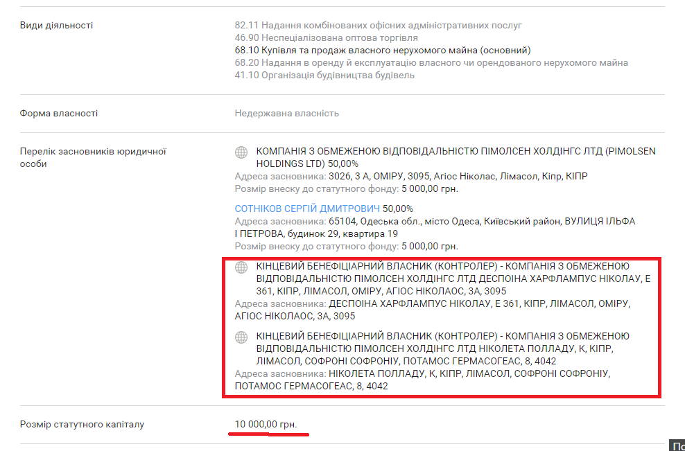 Уставной капитал фирмы, специализирующейся на покупке и продаже собственного недвижимого имущества, всего 10 тысяч гривен. Среди учредителей - кипрская компания, которая и является главным бенефициаром, и некий одессит Сергей Сотников. Таким образом, по сути, реальные владельцы стройки за Дворцом спорта скрыты кипрским офшором.