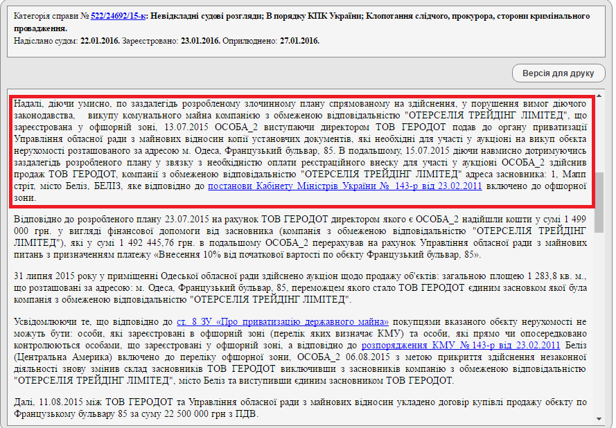 Кроме того, год назад данная фирма проходила по криминальному делу, согласно которому, связанное с компанией "Менеджмент инвестментс" ООО "Геродот" было создано специально для прикрытия незаконной деятельности белизского офшора, вследствие чего был выкуплен объект на Французском бульваре, 85. При этом, решение сессии Одесского облсовета о продаже данного объекта прошло в той же связке, что и свайное поле. И нежилые помещения площадью 1283 квадратных метра на Французском бульваре продали на том же аукционе, что и объект за Дворцом спорта. Стоимость строений в элитном районе Одессы составила всего 22,5 миллиона гривен.