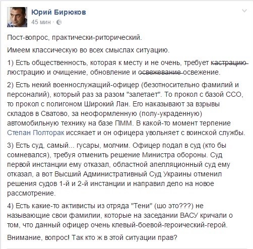 Генерал Хыжий, тот самый, которого называют непотопляемым из-за двух восстановлений после увольнений по суду, опять будет восстанавливаться. Последнее увольнение, за взрывы в Сватово и бардак на Ширлане, он обжаловал в двух судах. Ему отказали. Но Высший Административный Суд Украины отменил решение двух инстанций и отправил дело на новое рассмотрение. По слухам Хыжий занес за это решение 100 тыс долларов.