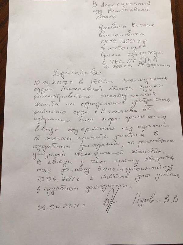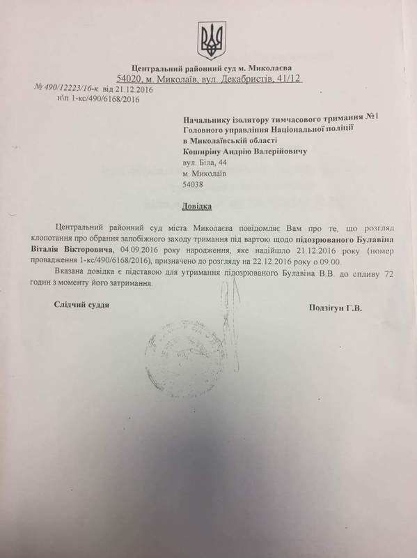 Як з’ясувалося пізніше, в ІТУ Булавін В.В. утримувався на підставі довідки (!) Центрального районного суду м. Миколаєва, а довідку підписувала суддя, яка й розглядала клопотання про обрання запобіжного заходу у вигляді тримання під вартою. Ось тут потрібна, мабуть, допомога Вищої Ради правосуддя, бо звичайної юридичної освіти не вистачає, аби з’ясувати на підставі якої саме статті КПК України виписувався такий новаторський процесуальний документ як «Довідка».