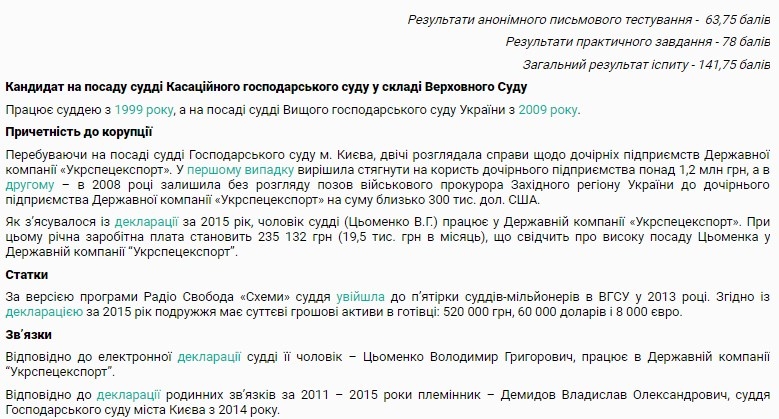 Также он обнародовал информацию и о семье Демидова. Дочь председателя ветеранской организации, как оказалось, является судьей Высшего хозяйственного суда Украины. Кроме того, претендует на должность судьи Кассационного хозяйственного суда в составе Верховного Суда.