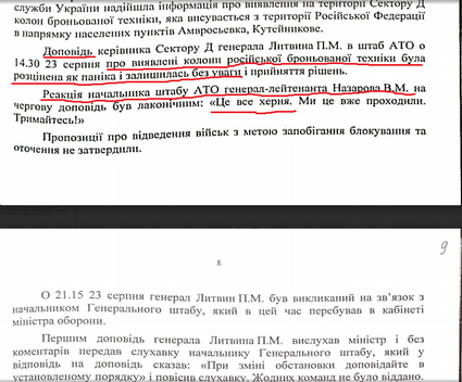 В материалах комиссии ВР говорится, что об опасности котла руководству было доложено накануне. Там есть и такой факт: когда в 10.30 праздничного дня офицеры сектора Д с передового командного пункта передали в Киев информацию о движении ста единиц российской техники, им ответил начальник штаба АТО Назаров: «Идите нах** трусы, я вас посажу!».