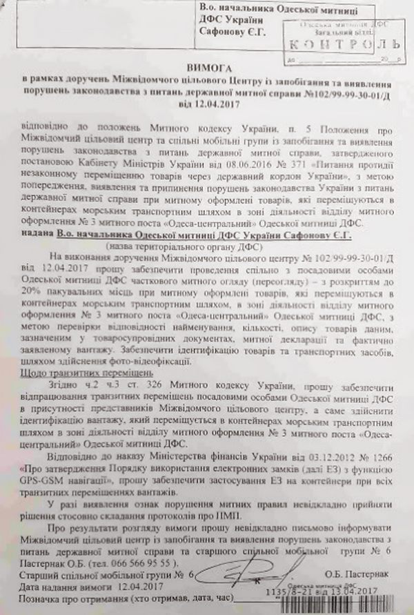 Начинаем разбираться. Какой-либо связи с назначением очередного и.о. начальника Одесской таможни нет: секретарь отвечает, что шеф на совещаниях. Сам Власов О. С., “Керівник Цільового Центру (!)”, который подписал остановившую “главный порт страны” бумагу, вроде бы вообще не при делах. Т. к. у его Центра нет полномочий выдавать поручения начальникам региональных таможен. Он должен их выдавать для своих мобильных групп. А тем более, у него нет права устанавливать формы и виды таможенного контроля для проходящих грузов. В том числе и транзитных.