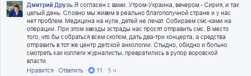 "Каждый божий день дикий ор, дикий! Нечеловеческий! Хоть не включай телевизор вообще. Я не понимаю смысла этих орущих, типа политических программ, ведь ничего не решают и не решат . Тогда зачем каждый день этот трэш ? Тошнит уже, честное слово, от всей этой словоблудной хрени, якобы приносящей рейтинг, кому он на ... нужен… На больных детей собираем всей страной смс сообщениями, что же каждый день нет программ о благотворительности?", - написала Поплавская.