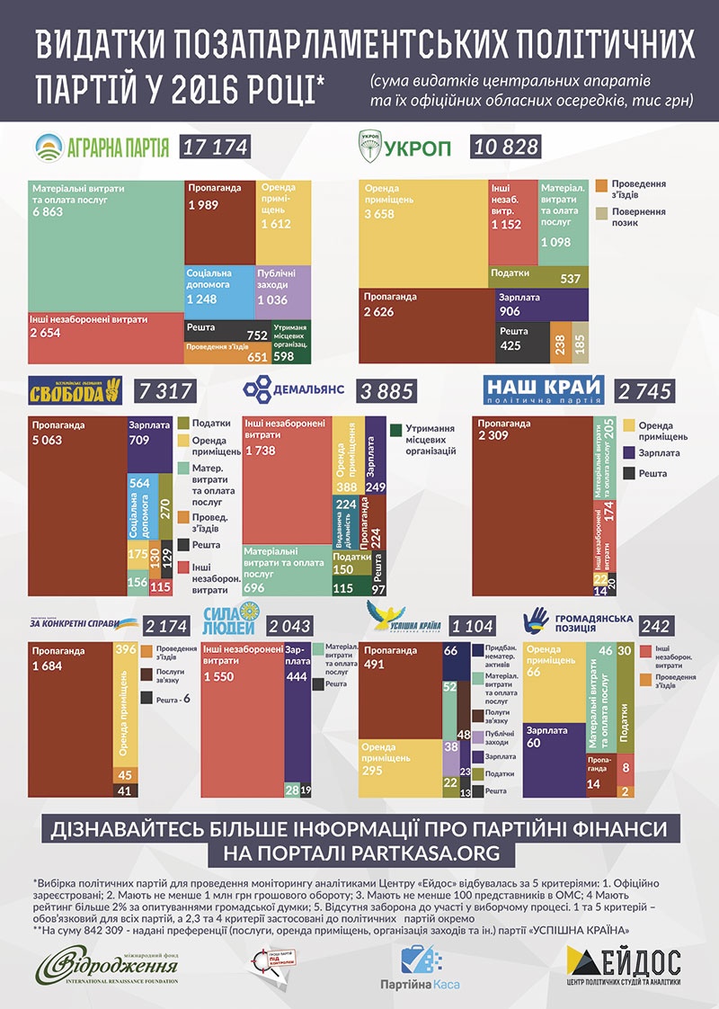 Для порівняння: бюджет Аграрної партії в 2,5 разу більший, ніж бюджет ВО «Батьківщина» та в 10 разів більший бюджету «Об’єднання «Самопоміч», якщо не брати до уваги бюджетної підтримки останніх двох.