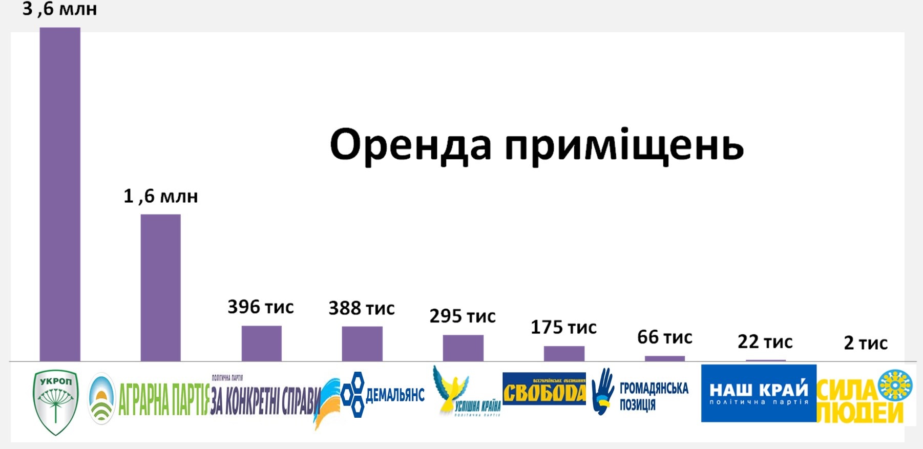 До порівняння: партія «Свобода» з більш як 500 осередками заплатила за оренду приміщень 175 тис. грн проти 3,6 млн грн, витрачених укропівцями.