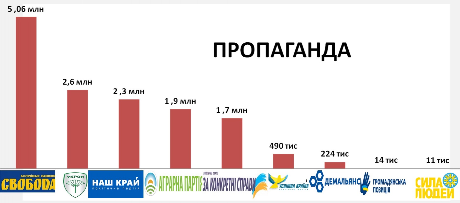 Також традиційно багато українські партії витрачають на так звану пропаганду. Хоча, у різних партій вона має різну мету і спрямування: якщо свободівці, які є абсолютними лідерами витрат за цією статтею, витрачають кошти на друк партійної газети, яка приносить потім партії дохід, то «Укроп», «Наш край», «За конкретні справи», котрі левову частку віддали на пропаганду, витратили кошти на рекламу.