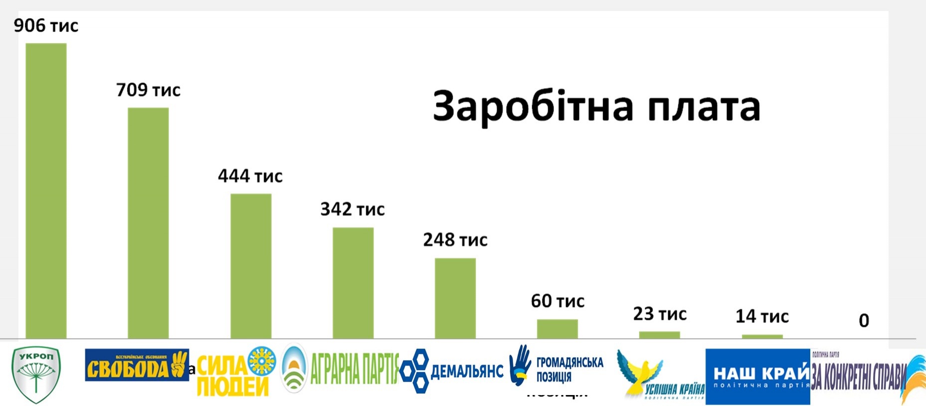 Проте досі залишаються партії, які, претендуючи на представництво українців в органах влади, намагаються підтримувати легенду про людський альтруїзм та або не показують заробітної плати працівників взагалі, або показують її на рівні кількох тисяч на рік. Йдеться, зокрема, про партії «За конкретні справи», «Наш край», «Успішну країну» та «Громадянську позицію».