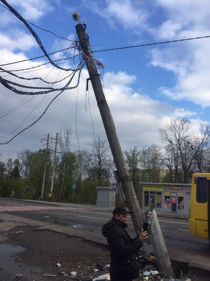У Львові на вулиці Липинського автобобіль на шаленій швидкості пролетів зупинку, зніс торгівельний МАФ та врізався у електроопору.