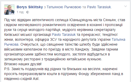 «Во время посещения аутентичного поселка Юаньцзяцунь города Сяньян, стал свидетелем неожиданного романтического признания в любви и предложения руки и сердца молодого партийца, мудрого руководителя секретариата Киевской городской организации Павла Тарасюка и прекрасной, хрупкой женщины, волонтера, офицера ВСУ и народного депутата Украины Татьяны Рычковой», — сообщил в своем Facebook юрист Борис Сиклитский.