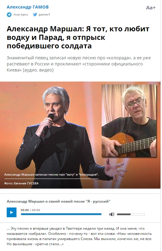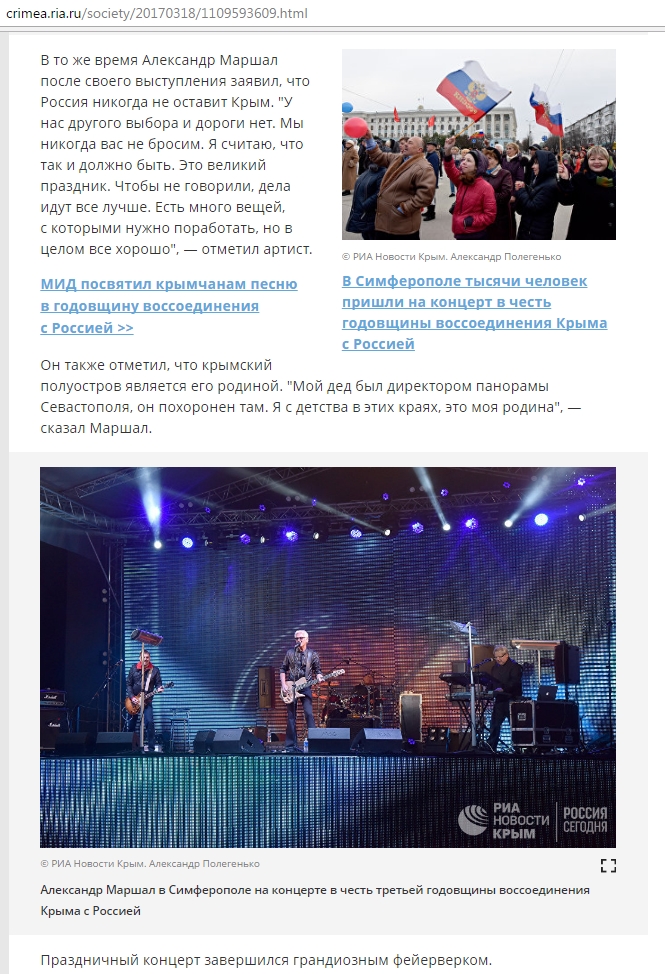 Авторы публикации отметили, что певец 18 марта этого года принял участие в концерте, посвященном трехлетию аннексии Крыма. Кроме того, он заявлял, что Крым – это Россия, и написал песню на слова крымского барда Владимира Кобеца "Я русский, я тот самый "колорад"". Артист не скрывает своей "собачьей преданности" российскому президенту Владимиру Путину и полностью одобряет политику, которую проводит хозяин Кремля.
