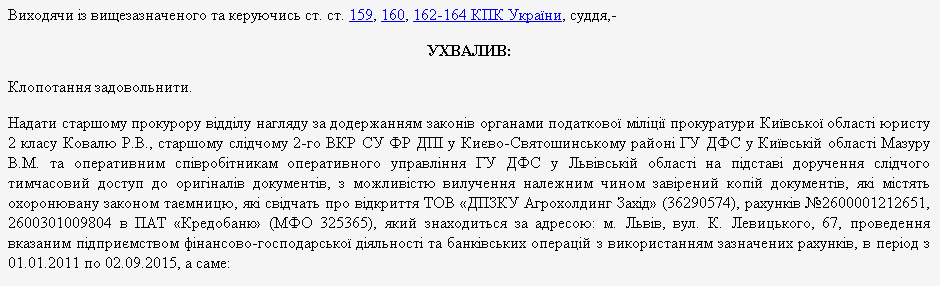 По данному уголовному производству Соломенский суд Киева разрешил следователям получить доступ к банковским документам ООО "ДПЗКУ Агрохолдинг Запад" в банке "ПУМБ" и в "Кредобанке":