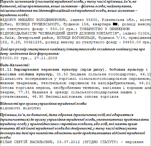 Предприятие, где в 2012 – 2014 годах числился руководителем нынешний главный налоговый милиционер, называется ООО "ДПЗКУ Агрохолдинг Запад". Юридический адрес фирмы – в Ровенской области, в селе Горыньград-Первый Ровенского района. Во время руководства Билана учредителем фирмы с долей 99% было ООО "Международный центр деловых контактов".