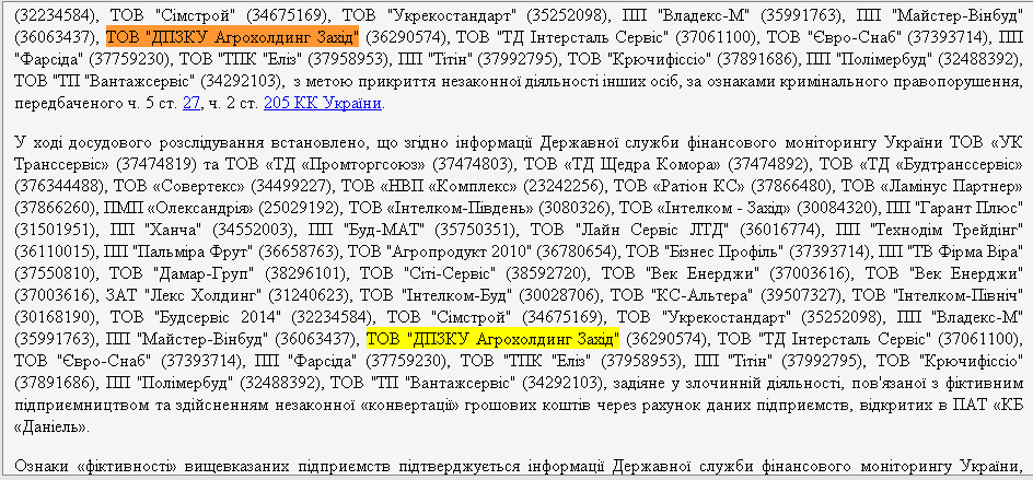 ООО "ДПЗКУ Агрохолдинг Запад", где числился директором Сергей Билан, десятки раз упоминается в судебных определениях, связанных с уголовным производством по отмыванию средств. Вот фрагмент одного их судебных решений: