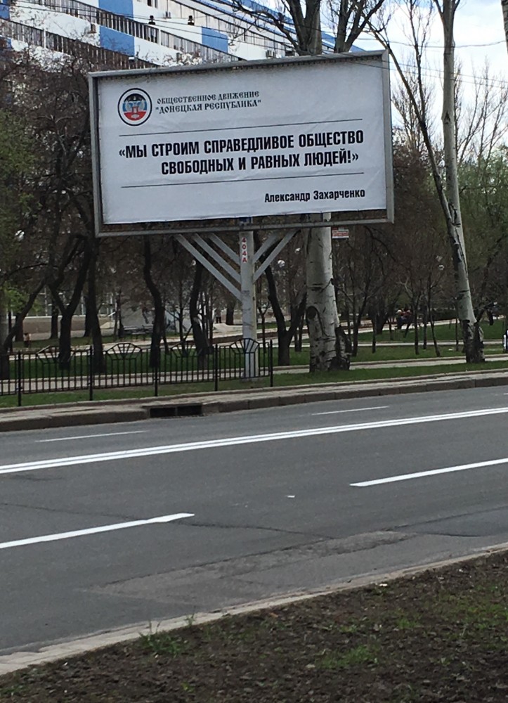 Но не будем о пустоте… Чего в городе полным-полно, так это лозунгов и вывесок. Посмотришь налево – серп и молот увидишь, направо – «Я люблю «ДНР», назад – «Я люблю Россию», вперед – одну из цитат главаря «ДНР» Александра Захарченко. И т.д.
