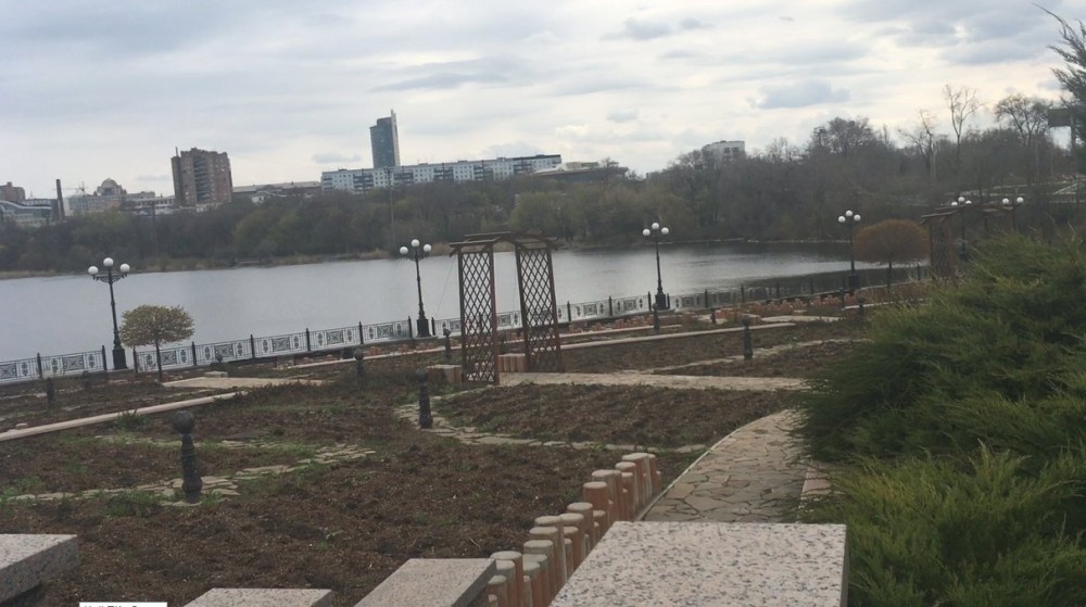 Во-первых, несмотря на исправную работу коммунальщиков, чистые улочки и под линейку высаженные клумбы, от красивых идеалов, тщательно расписанных в рассказе Ионеско, город весьма далек. Солнца здесь очень мало, ветер – холодный, да и трава, образно говоря, не зеленая. Архитектурный стиль, как можно увидеть на фото и видео, тоже довольно таки сдержанный, без излишеств. Не считая, футбольного стадиона «Донбасс Арена», на входе в который с наступлением вечера светится большой баннер с надписью: «Донецкая народная республика». К слову, все в этом городе – исключительно «народное».