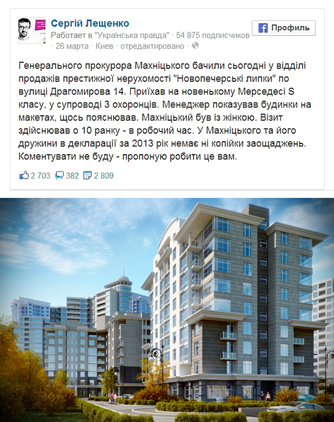 Еще нюанс: интернет-банкингом Олег Махницкий воспользовался уже под утро (платежи осуществлялись в 04:19 и 04:51 соответственно). Впрочем, это как раз легко объяснимо - именно 26 марта, но уже в 10 часов утра, известный журналист Сергей Лещенко встретил генпрокурора с женой на улице Драгомирова, у центра продаж элитного жилого квартала «Новопечерские Липки». Чета Махницких прибыла туда на служебном «Мерседесе» главы семейства, чтобы обсудить условия покупки целого этажа в одном из клубных домов.