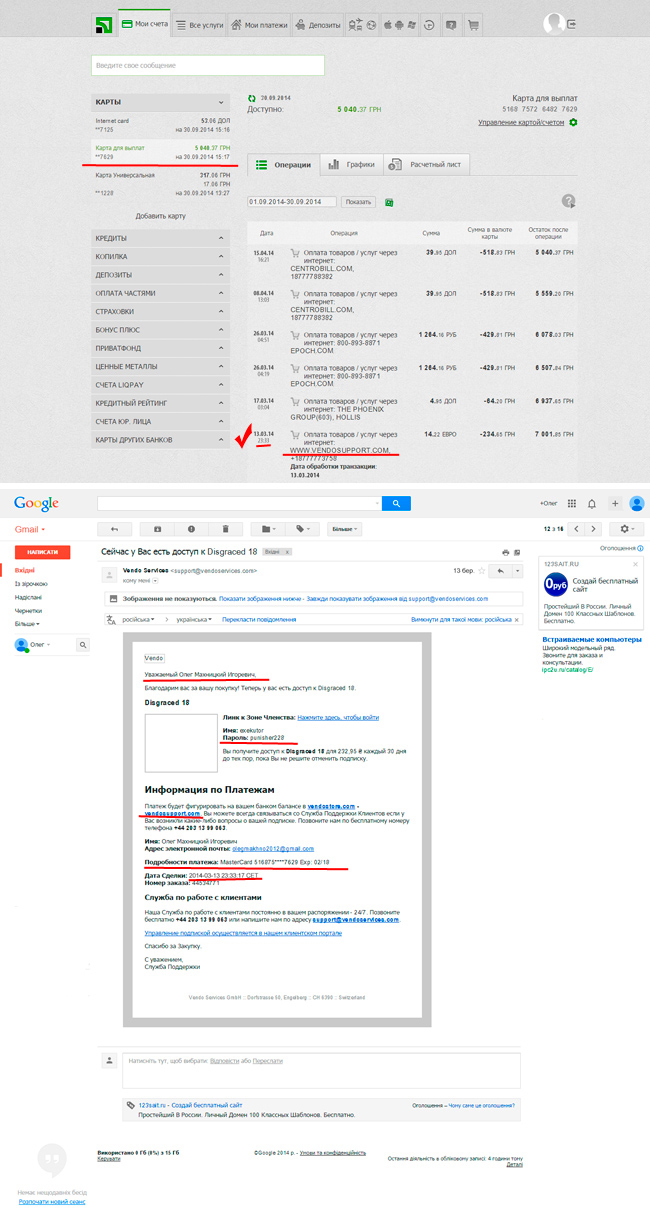 Для того чтобы убедиться, что аккаунт в «Приват 24», с которого осуществлялась оплата доступа к порно-сайтам, действительно принадлежит Олегу Махницкому, достаточно посмотреть платеж за 13 марта, отправленный Vendo Services – международному реселлеру, предоставляющему право доступа к любым видам цифрового контента и программного обеспечения. В электронном письме, сообщающем об успешном прохождении платежа и выдаче доступа к услугам сервиса, указаны личные данные плательщика – ФИО, а также номер его карты, совпадающий с данными карты для выплат в аккаунте «Приват 24». Кстати, идентично ивремя транзакции - 23:33.