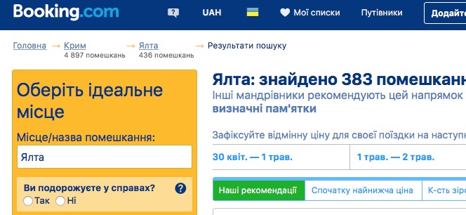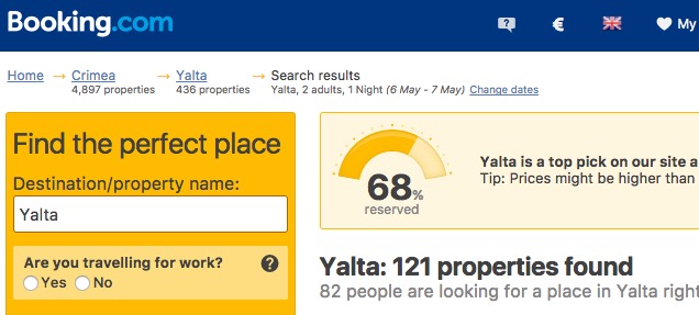 В тоже время мы решили проверить, как сервис отображает названия городов в Крыму. Как видно на скриншоте, нет никакого упоминания про Украину. Сервис поиска отелей просто назвал Крым Крымом без привязок к стране.