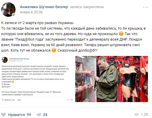 Так, Безлер написал: «К записи от 2 марта про развал Украины. То ли гвозди были не той системы, что каждый день забивались, то ли крышка, в которую они вбивались, не из того дерева. Но чуда не произошло
