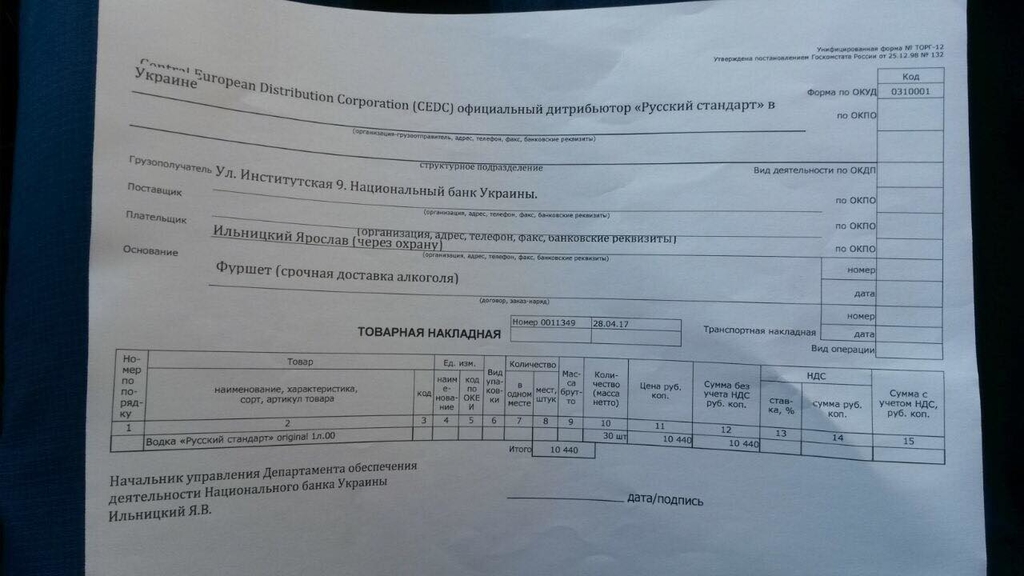 В качестве доказательств своей теории журналист приводит снимки пользователя Facebook Алиши Ярцевой с водкой «Русский стандарт» и накладной на соответствующий заказ якобы для НБУ. Однако официально данная информация пока не подтверждена.