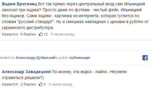 Александр Дубинский, украинский журналист, на своей странице в социальной сети опубликовал фото и пост о водке "Русский стандарт", продажа которой запрещена в Украине, но три ящика привезли под стены НБУ.